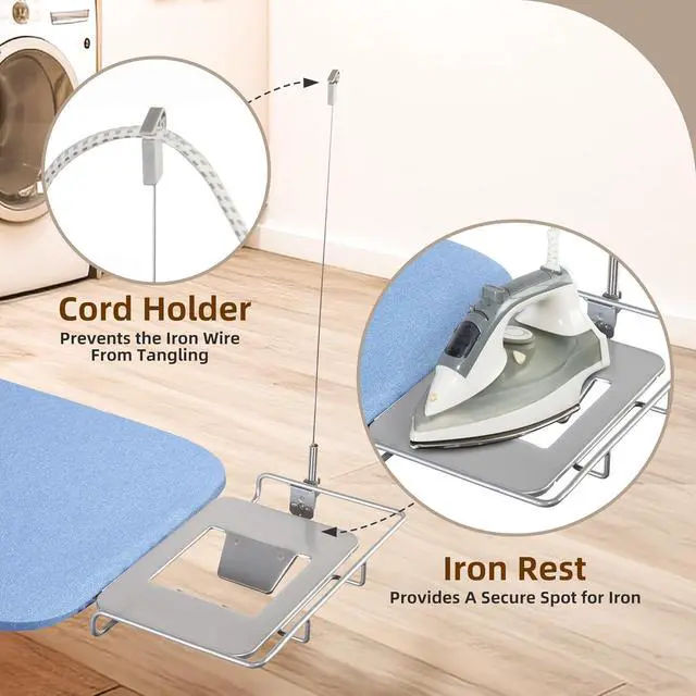 KEEP YOUR IRON AND CORD ORGANIZED: This iron table includes a built-in holder, making it more convenient to store the iron and preventing it from accidentally falling off the board. Moreover, the durable ironing board is equipped with a convenient cord holder, allowing you to keep the cord neatly organized. If the cord holder is not needed, it can be easily folded down