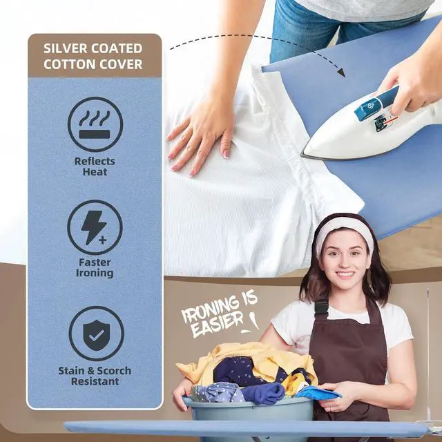 EFFICIENT IRONING EXPERIENCE: Elevate your ironing with this high-performance ironing board. Its advanced features include an extra thick silver coated cotton cover, 7mm felt padding, and a durable steel mesh top. This winning combination of materials is specifically engineered to withstand high heat and steam, allowing for faster and more efficient ironing sessions