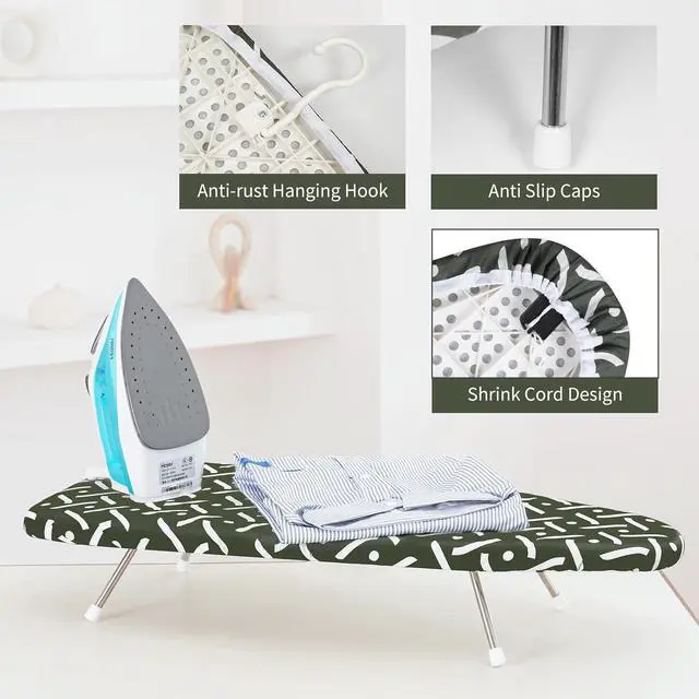 • PRACTICAL DESIGN: Features a built-in retractable hook for easy closet storage, with secure fittings to keep all parts in place when not in use. Non-slip foot pads provide stability during ironing, ensuring safety and preventing sliding.