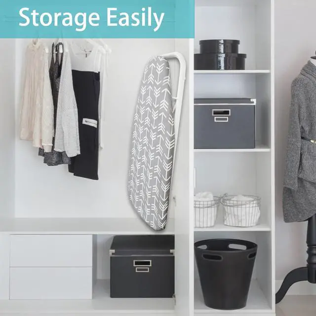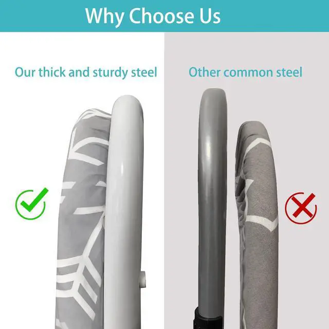 HIGH QUALITY WITH STURDY STEEL: Our ironing board is made of sturdy steel, 3 layers with 10mm thickness felt padding, it is more sturdy and thicker than the common small ironing board. You never need to worried about leaving marks on the clothes as the padding is thick enough for a fast and wrinkle free ironing. It is Non-slip metal legs and locked feet design provide fantastic rigidity, you don' t worry it is not secure when the board in use.