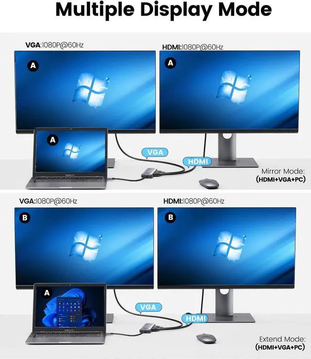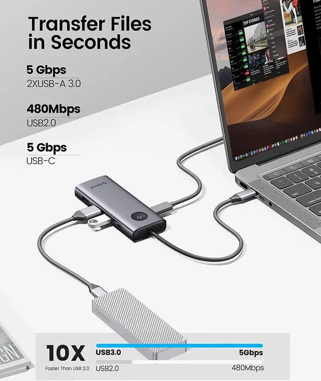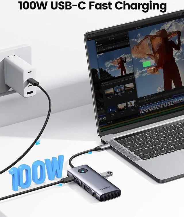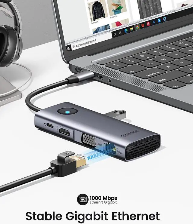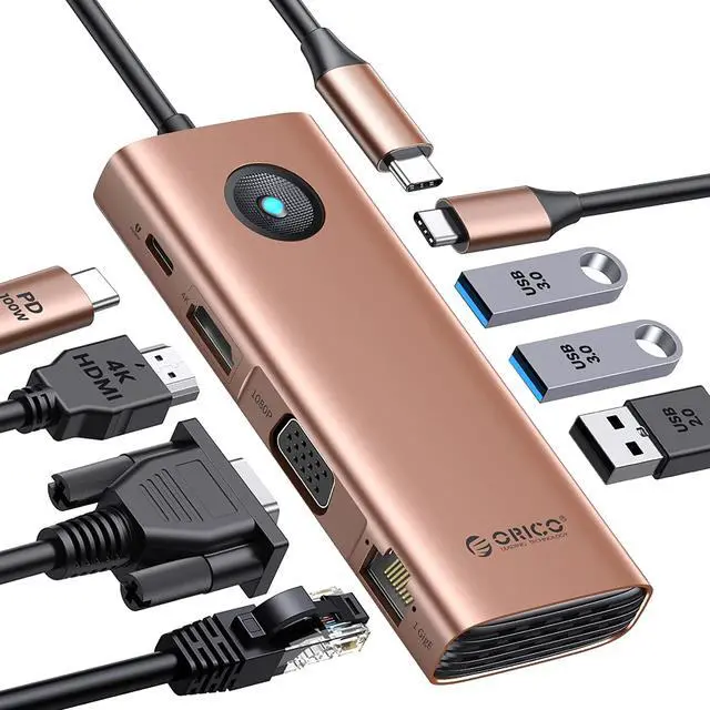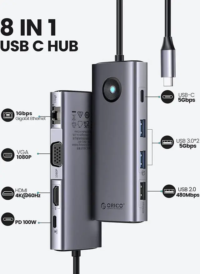 ORICO USB C docking station has perfectly combined the function of USB C hub and docking station, it turns a usb c port into 8 ports: an HDMI 2.0 4K@60HZ output, a VGA port, a 100W USB-C Power Delivery port, an RJ45/Ethernet input, 2 super speed USB-A 3.0 Ports, a 5Gbps Type-C port, 1*USB2.0 Port for Wireless Mouse or keyboard.