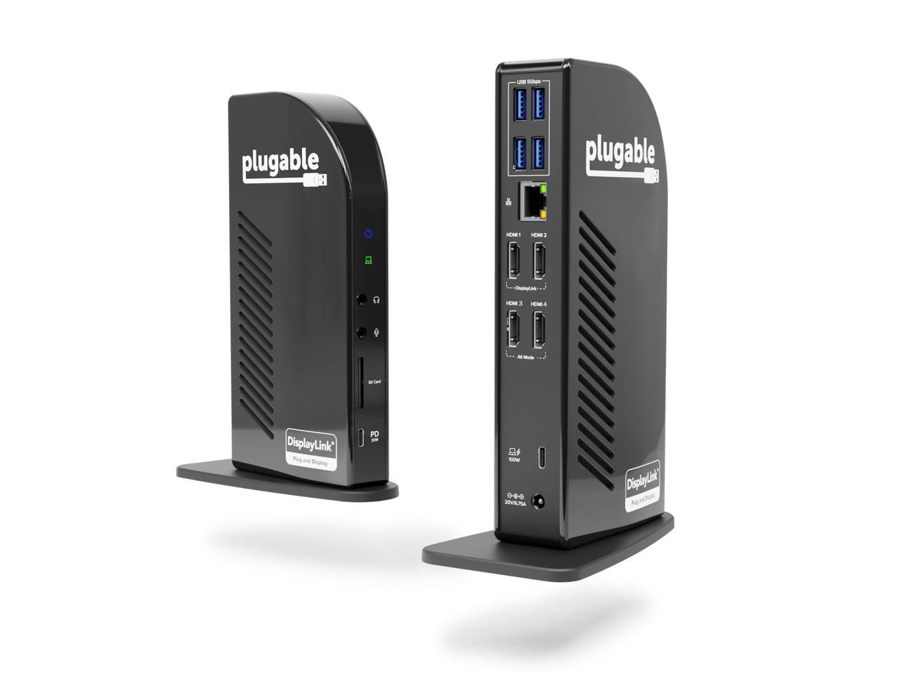 - Port Potential - Make room for all of your connected gadgets. This Plugable docking station has 1x USB-C port for 5Gbps data and 20W charging, 4x USB 3.0 5Gbps ports, Gigabit Ethernet, an SD Card Reader, and audio in/out ports