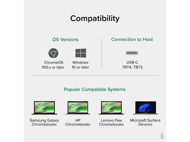 - Compatibility - Laptop docking station is compatible with ChromeOS and Windows 10 and newer. Supports secure, Google-managed firmware updates in ChromeOS. On macOS, only a single extended monitor is supported. DP 1.4 host is required for Dual 4K 60Hz