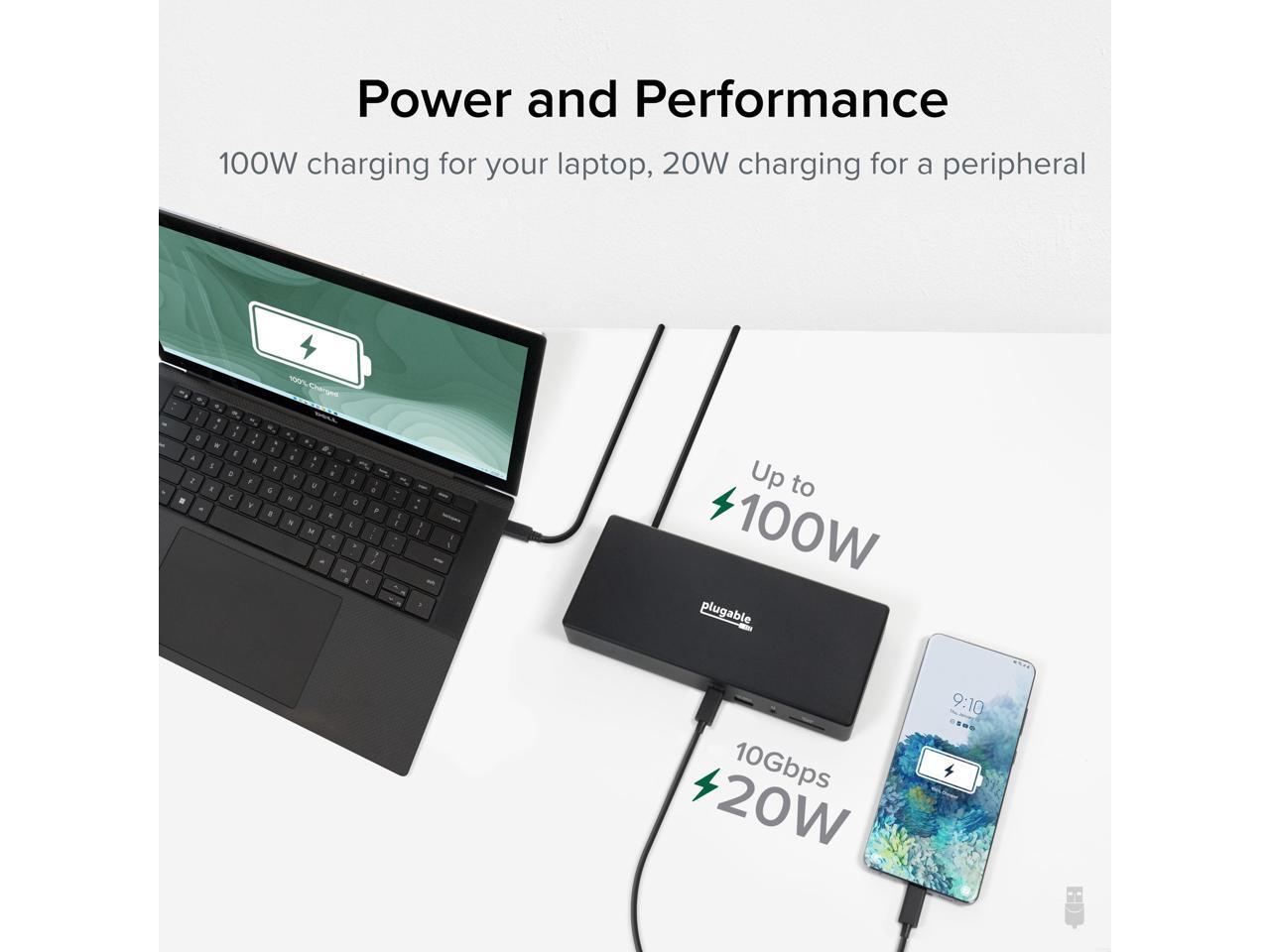- Power Delivered - This 3 monitor docking station keeps you charged all day with 100W Power Delivery. For your phone or accessories, a USB-C port on the front of the dock delivers up to 20W charging