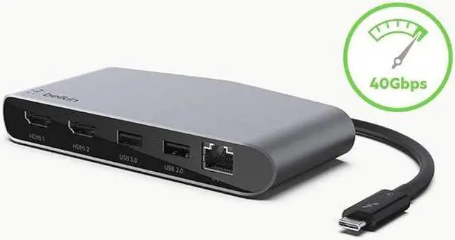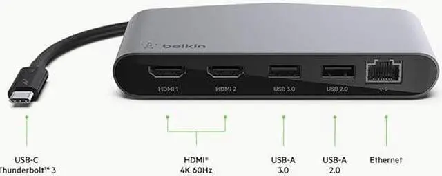 HARNESS THUNDERBOLT ANYWHERE Turn your Mac or Windows laptop into a powerful work station, using the power and speed of Thunderbolt 3. This compact dock connects to your computer via a single tethered cable. Dual HDMI 4K ports at 60Hz allow you to connect two 4K monitors to your laptop, to experience fast, high definition visuals across multiple screens. Use a keyboard, mouse, or other peripherals via the USB-A 3.0 and USB-A 2.0 ports and enjoy a secure and reliable network connection through the gigabit Ethernet port. THE BELKIN DIFFERENCE Pioneer in technology and innovation for over 35 years High-quality components and construction ensure continued quality, even with heavy use Premium aluminum enclosure integrates seamlessly to your laptop environment A TRULY PORTABLE WORKSTATION Harness the speeds, quality and power of your Thunderbolt 3 laptop with a portable and compact dock that's always up to the task.