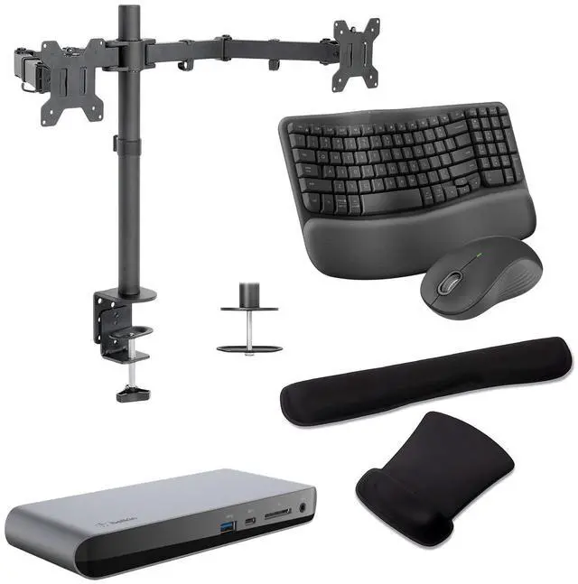 The Belkin Thunderbolt Dock Bundle with MK670 Wireless Keyboard and Desk Mounted Monitor Stand provides a complete and efficient workstation setup, perfect for both home and office environments. This bundle enhances productivity with seamless connectivity, ergonomic typing, and versatile monitor positioning. Ideal for professionals and remote workers, it ensures a clutter-free, organized workspace with everything needed for a streamlined workflow.