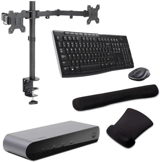 The Belkin Thunderbolt Dock Bundle with MK270 Wireless Keyboard and Desk Mounted Monitor Stand provides a complete and efficient workstation setup, perfect for both home and office environments. This bundle enhances productivity with seamless connectivity, ergonomic typing, and versatile monitor positioning. Ideal for professionals and remote workers, it ensures a clutter-free, organized workspace with everything needed for a streamlined workflow.