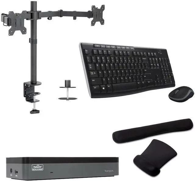 The Targus Dock Bundle with MK270 Wireless Keyboard and Desk Mounted Monitor Stand provides a complete and efficient workstation setup, perfect for both home and office environments. This bundle enhances productivity with seamless connectivity, ergonomic typing, and versatile monitor positioning. Ideal for professionals and remote workers, it ensures a clutter-free, organized workspace with everything needed for a streamlined workflow.