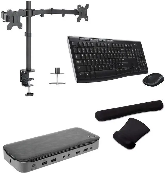 The Targus Dock Bundle with MK270 Wireless Keyboard and Desk Mounted Monitor Stand provides a complete and efficient workstation setup, perfect for both home and office environments. This bundle enhances productivity with seamless connectivity, ergonomic typing, and versatile monitor positioning. Ideal for professionals and remote workers, it ensures a clutter-free, organized workspace with everything needed for a streamlined workflow.