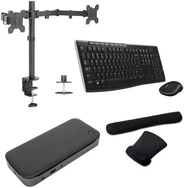 The Targus Dock Bundle with MK270 Wireless Keyboard and Desk Mounted Monitor Stand provides a complete and efficient workstation setup, perfect for both home and office environments. This bundle enhances productivity with seamless connectivity, ergonomic typing, and versatile monitor positioning. Ideal for professionals and remote workers, it ensures a clutter-free, organized workspace.