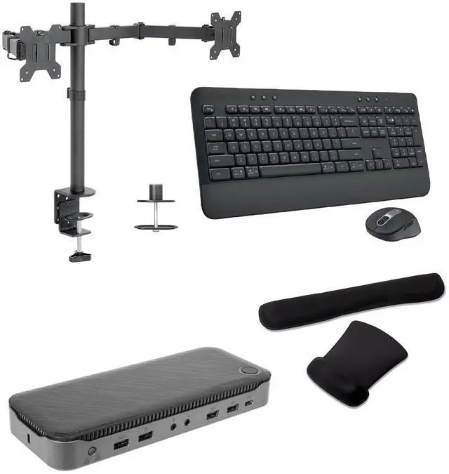 The Targus Dock Bundle with MK650 Wireless Keyboard and Desk Mounted Monitor Stand provides a complete and efficient workstation setup, perfect for both home and office environments. This bundle enhances productivity with seamless connectivity, ergonomic typing, and versatile monitor positioning. Ideal for professionals and remote workers, it ensures a clutter-free, organized workspace.