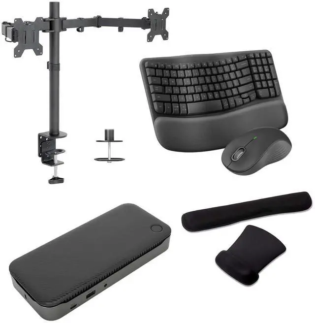The Targus Dock Bundle with MK670 Wireless Keyboard and Desk Mounted Monitor Stand provides a complete and efficient workstation setup, perfect for both home and office ``environments. This bundle enhances productivity with seamless connectivity, ergonomic typing, and versatile monitor positioning. Ideal for professionals and remote workers, it ensures a clutter-free, organized workspace with everything needed for a streamlined workflow.