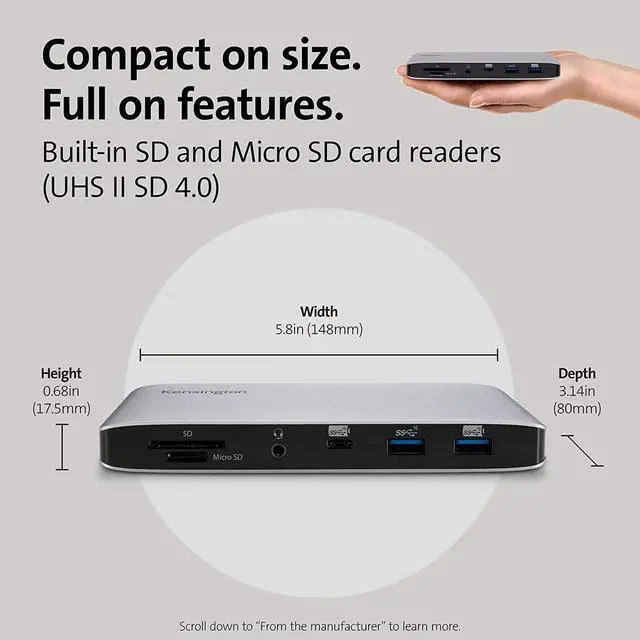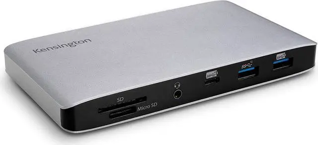 SD card reader and Micro SD card reader (both UHS II SD 4.0 ); one USB-C Gen2 port (up to 10Gbps with 5V/ 1.5A charging), three USB-A ports [2 Gen2@10Gbps on the front (one with 5V/ 1.5A charging) and one Gen1@5Gbps port on the rear of the dock supporting 5V/ 0.9A ], Gigabit Ethernet port; 3.5 mm headphone/speaker/microphone combo jack; Kensington lock slot; VESA mounting holes