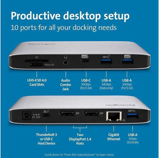 Thunderbolt 3 dock for MacBooks (OS 10.16 and later) and Windows laptops equipped with Thunderbolt 3 (Lenovo Dell HP Acer, Asus, MSI, Razer, and more) with transfer speeds of up to 40Gbps; also compatible with Thunderbolt 4 laptops (at TB3 speeds) and USB-C laptops and Surface devices (at up to 10Gbps USB-C speeds) including Surface Pro 9, 8, 7, Surface Laptop 3 and 5, Surface Books and Surface Go