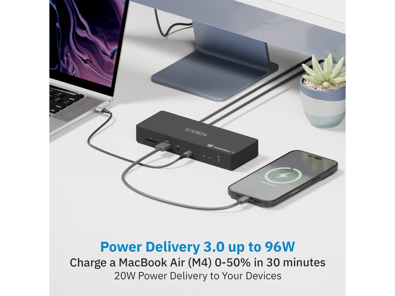 - Power Delivery 3.0 up to 96W for charging host laptops
