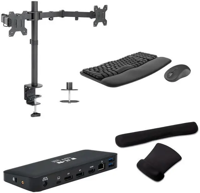 The Tripp Lite USB-C Dock Bundle with MK670 Wireless Keyboard and Desk Mounted Monitor Stand provides a complete and efficient workstation setup. This bundle enhances productivity with seamless connectivity, ergonomic typing, and versatile monitor positioning. Ideal for professionals and remote workers, it ensures a clutter-free, organized workspace with everything needed for a streamlined workflow.