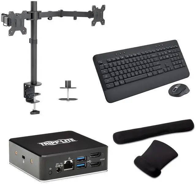 The Tripp Lite USB-C Dock Bundle with MK650 Wireless Keyboard and Desk Mounted Monitor Stand provides a complete and efficient workstation setup. This bundle enhances productivity with seamless connectivity, ergonomic typing, and versatile monitor positioning. Ideal for professionals and remote workers, it ensures a clutter-free, organized workspace with everything needed for a streamlined workflow.