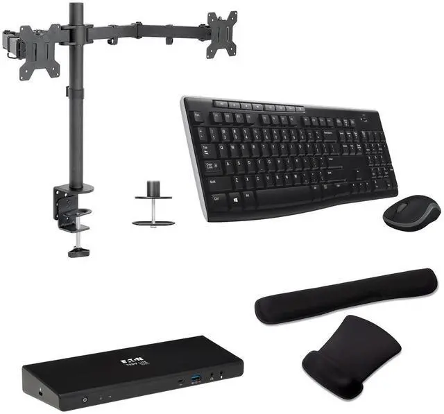 The Tripp Lite USB-C Dock Bundle with MK270 Wireless Keyboard and Desk Mounted Monitor Stand provides a complete and efficient workstation setup. This bundle enhances productivity with seamless connectivity, ergonomic typing, and versatile monitor positioning. Ideal for professionals and remote workers, it ensures a clutter-free, organized workspace with everything needed for a streamlined workflow.
