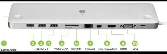 3 x USB-A Port for peripheral sharing; 1 x BC1.2 for fast charging; Build-in SD/MMC/Micro SD card readers