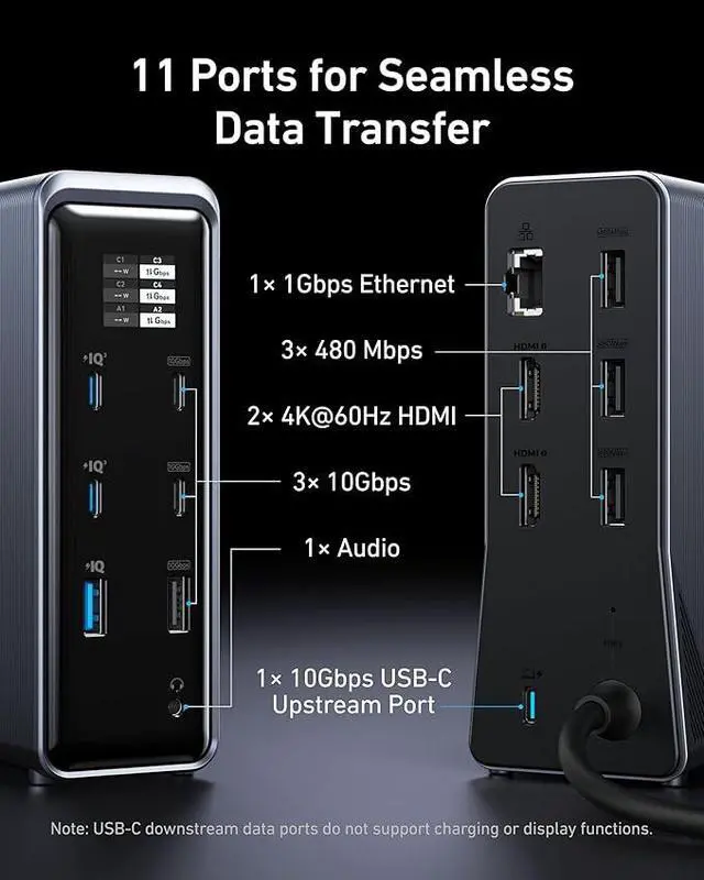 Master Your Data Flow with 11 Ports: Efficiently manage data across multiple devices with versatile ports offering speeds up to 10Gbps, complemented by dual 4K display and audio options.