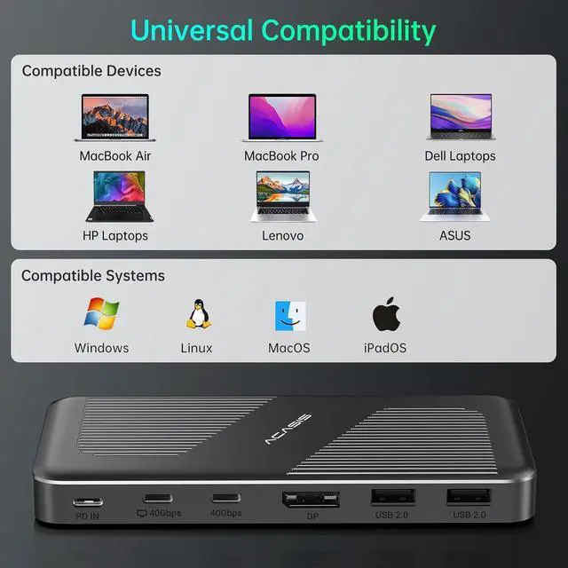 11 in 1 40Gbps Docking Station - The ACASIS 40Gbps dock compatible with Thunderbolt 3/4 expands to 2x40Gbps, 1xDP 8K 60HZ, PD 100W, 2x USB C 3.0 (5Gbps), 1x USBA 3.0, 4 x USBA 2.0. No need any drivers or software, just plug and play.
