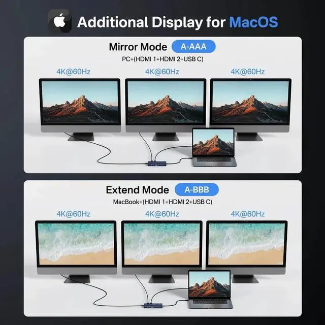 On Windows, you can connect up to 3 external displays simultaneously using the Dock's 2 HDMI ports and 1 USB-C port in various connection modes, all supporting 4K@60Hz. Only in extended mode (A-BCD), the dock outputs 4K@60Hz, 4K@60Hz, and 4K@30Hz.