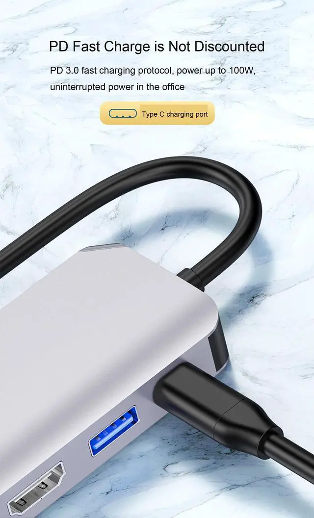 There is a PD 3.0 port of this hub, allowing 100W power input and you dont need to worry about power consumption when using. Just plug the charging adapter and keep your laptop on power all the time.