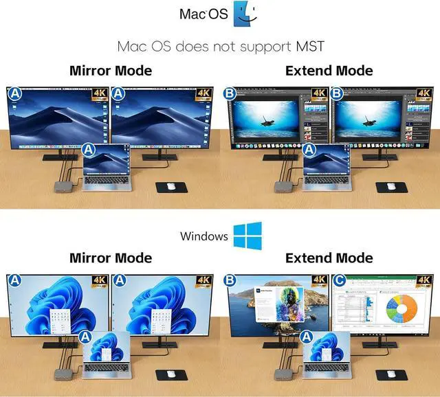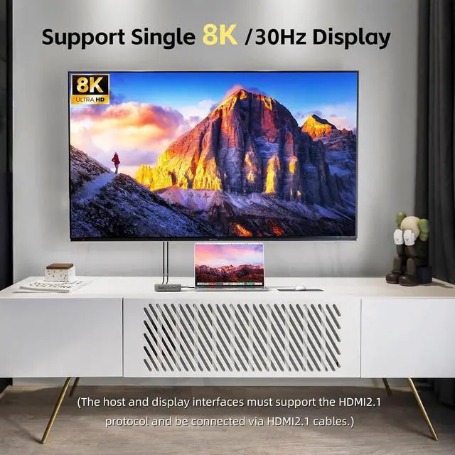 This Docking Station has 2 HDMI monitor display ports, one of them is HDMI2.1 supports 8K/30Hz monitor, another port is HDMI 2.0, supports 4k/60Hz, supports dual 4K/60Hz monitors displaying at the same time.