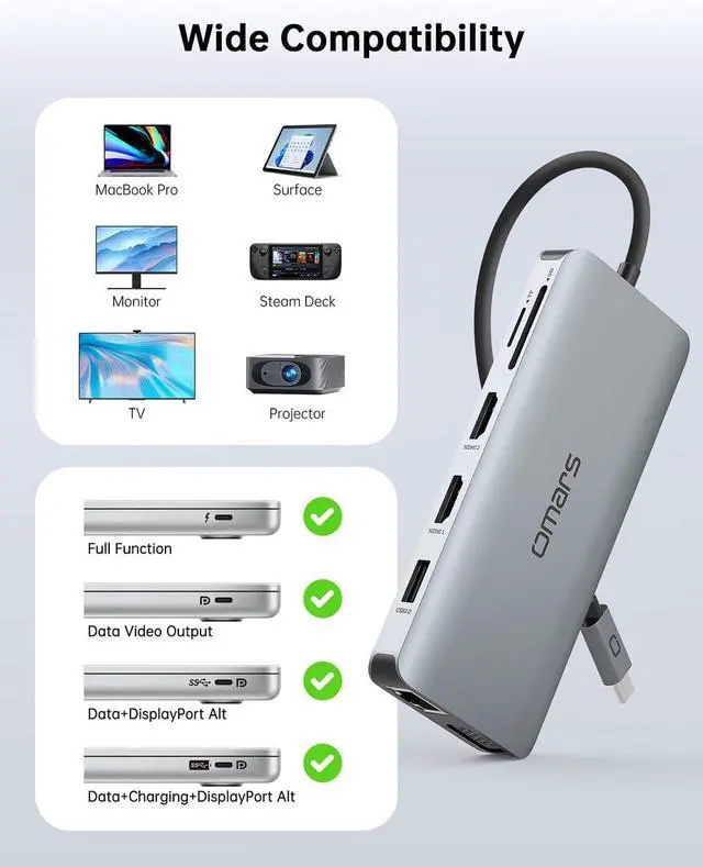 11 in 1 USB-C Docking StationOmars USB C hub turns a single USB-C port into a docking station with 2 HDMI, 1 VGA port, 2 USB 3.0 port, 2 USB 2.0 port,1 Type C charging port, 1 Ethernet port and1 SD & 1 TF card Reader to be more lightweight, portable and powerful.