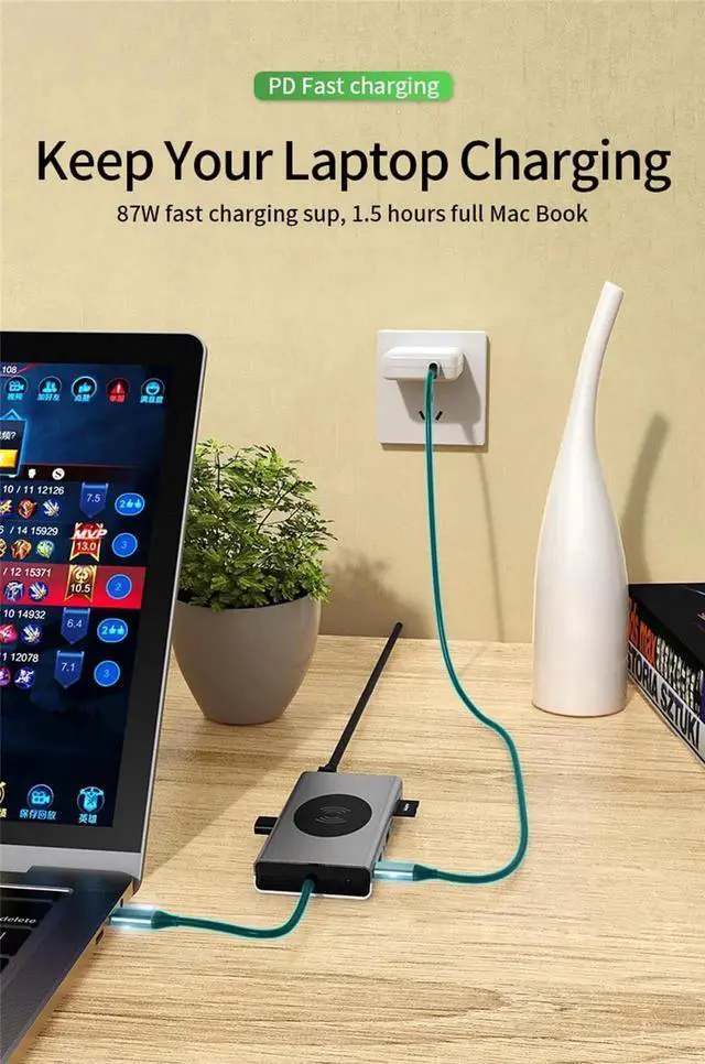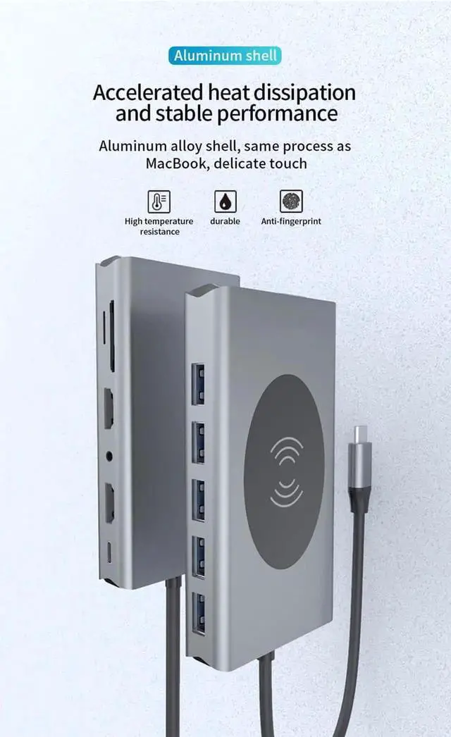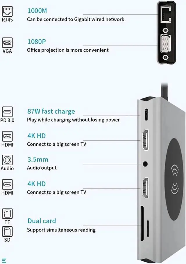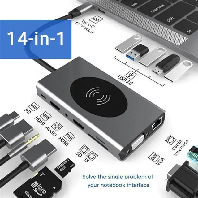 Extensive capability14-in-1 USB Type C hub includes Ethernet/RJ-45 Port, 100W PD, 5 USB 3.0 Ports, Dual 4K HDMI video output. Vga, Micro SD & TF card reader, 3.5 mm Audio jack and Wireless charing.