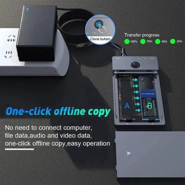 One-Key Offline Cloner An easy clone, No need to use the comupter. Just plug the two M2. NVME SSDs in and hooked up the power, click the Clone button for 3-5 seconds to quickly clone all files from A SSD to B SSD, there are LED status indicators and the process completed quickly.