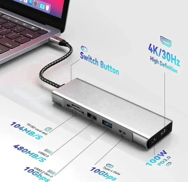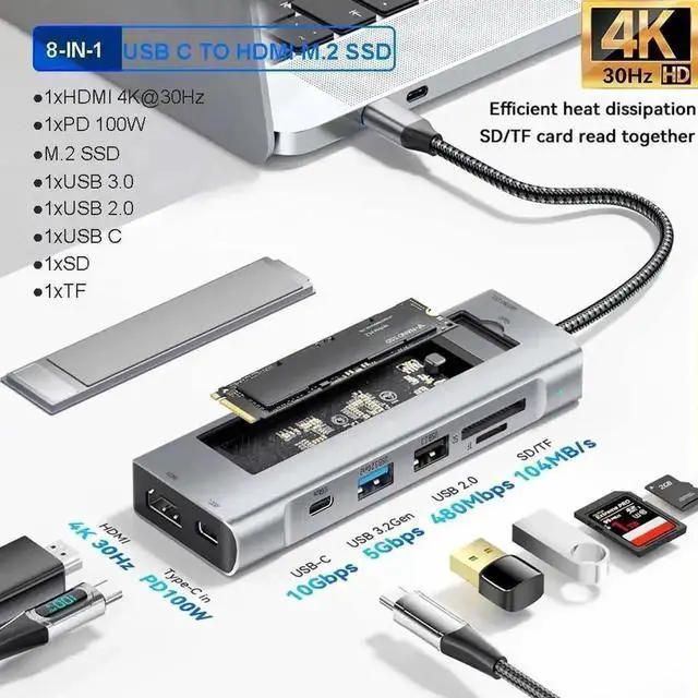 10Gbps ULTRA-FAST DATA TRANSFER & PD100W FAST CHARGING - The USB C hub is equipped with one USB A port and one USB C ports, as well as a built-in M. 2 SSD slot, both supporting USB 3.2 Gen2 10Gbps speeds, which can transfer/return 1GB of video, music, photos and other files in just 1 second. There are also one USB 3.2 USB-A ports that support 10Gbps transfers. There is also a separate PD100W power supply interface to charge your laptop and never have to worry about running out of power again.