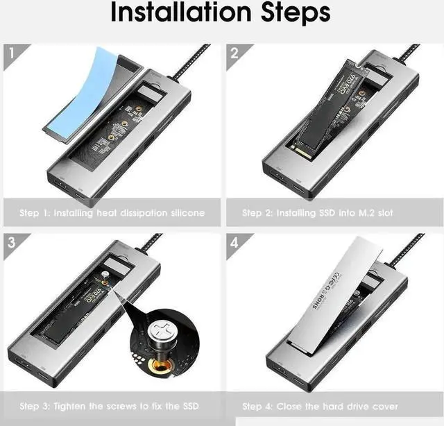 USB C HUB WITH M. 2 ENCLOSURE - Innovative combination of M. 2 ssd enclosure and USB hub, this USB-C hub with M. 2 SSD enclosure breaks the traditional model and expands more new possibilities, compatible with M. 2 NVME and SATA SSD, with which you can install M. 2 2230/2242/2260/2280 SSD to expand storage. Suitable for Windows, Mac OS, Linux, Chromebook OS. Support OTG function.