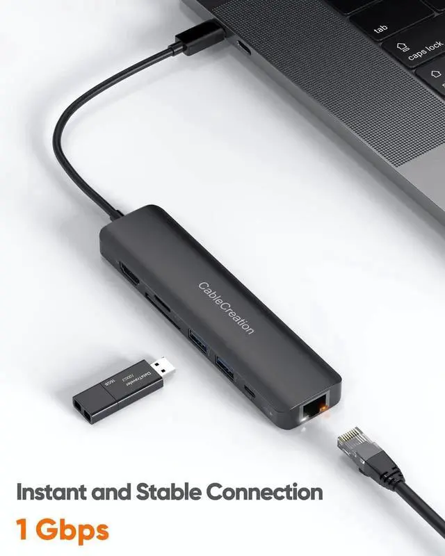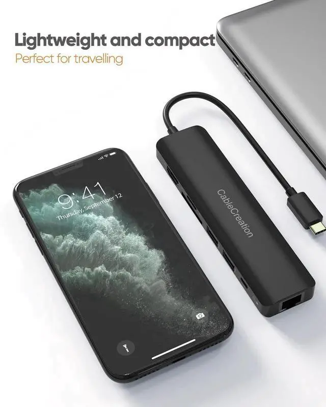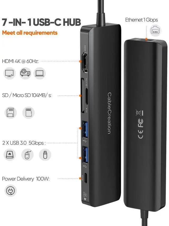 Multifunctional USB C Multiport Hub, It is Type C Hub With 4K 60Hz HDMI, 1Gbps RJ45 Ethernet, SD & TF card readers, 100W PD Charging, and 2 USB 3.0, allowing to extend Type-C port of the host to be multiple portsInstruction:Input Port: USB-C Male X 1Output Port: 4K 60Hz HDMI Female X 1 1Gbps Ethernet port X 1 100W PD charging port X 1 104M/s SD / TF card slots X 25Gbps USB 3.0 Female X 2Compatible Devices Include: MacBook / MacBook Pro ( 2021 / 2020 / 2019 / 2018 / 2017) MacBook Air (2021 / 2020 / 2019 / 2018) iMac 2017 / iMac Pro / Mac Mini iPad Pro (2021 / 2020 / 2019 / 2018)XPS 15 & 13 & 12 Surface Book 2 / Surface Go Pixelbook (2019 / 2018 / 2017)Samsung Galaxy S10 / S9 / S8, Note 9 / 8, Tab S4 / S6 / S5eSupported Systems: Windows 10, 8, 7, Vista, XP, Mac OS X 10.6 or later, Linux 2.6.14 or Later 60Hz supports for the 10 devices: MacBook Air 13 2020 MacBook Pro 15 2019 / 2018 MacBook Pro 16 2019 iPad Pro 12.9 2020 / 2018 iPad Pro 11 2020 / 2018 iMac 21.5 2019 iMac 27 20197-IN-1 Type-C Hub Adapter1 X Ethernet: Up to 1000 Mbps (CAT6 & up Ethernet cables needed to reach 1 Gbps.)1 X HDMI: up to 4K@60Hz (only available for devices with DisplayPort 1.4 ), backward compatible with DisplayPort 1.2 (the refresh rate at 4K@30Hz ), for HDMI-equipped Monitor / Display / TV1 X USB C (Power Delivery): Up to 100W (Recommend using higher than 65watt charger for Phones / Tablets). Not support video output / data transfer1 X SD Card Reader: UHS-I mode, read-n-write with SD Card / SDHC / SDXC / RS-MMC1 X Micro SD Card Reader: UHS-I mode, for MicroSD / MicroSDHC / Microsdxc2 X USB 3.0: Up to 5 Gbps 5V 0.9A, for USB flash drive / Mouse / Keyboard / Card reader / Camera / Printer / Hard drive, backward compatible with USB 2.0, up to 480Mbps, for Mouse / Keyboard / Printer