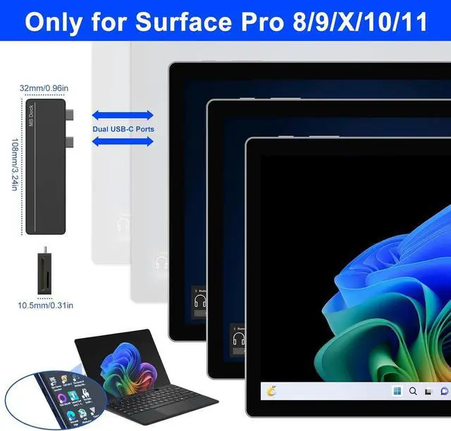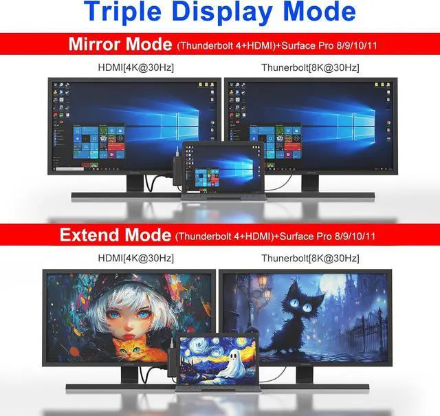 The split-screen display function of the Surface Pro 10/9/8 Hub allows you to expand two screens (4K@30Hz HDMI + 8K@30Hz USB-C Thunerbolt 4). Supports Extend or Mirror Mode.