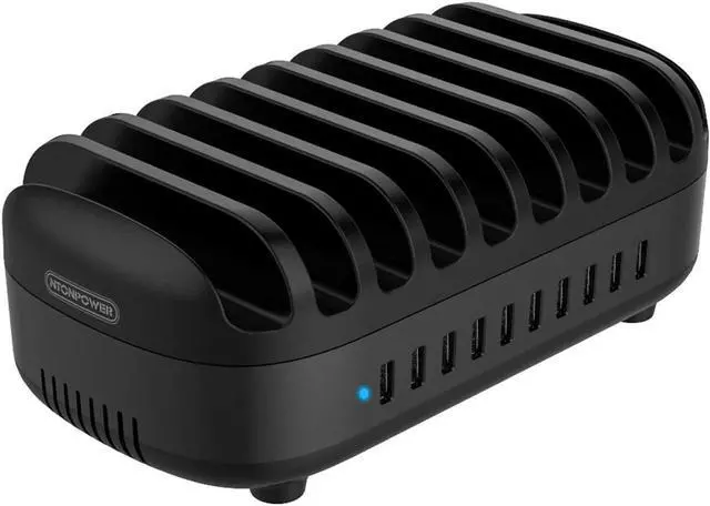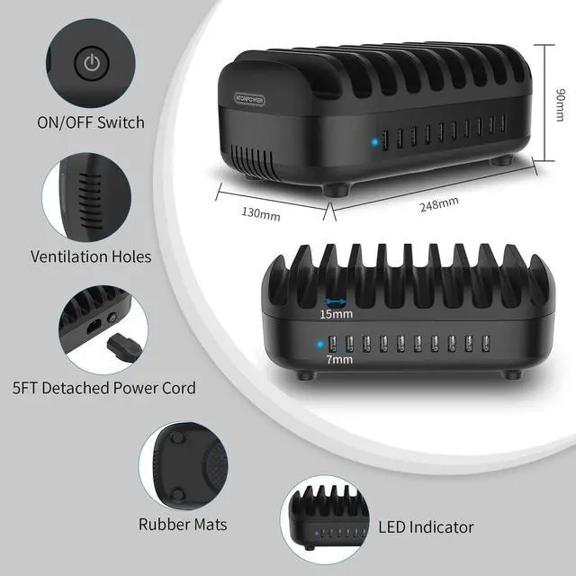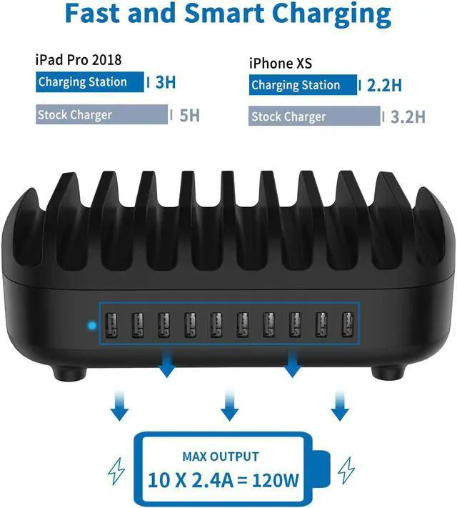 • [120W POWERFUL USB CHARGING STATION]: Not like other charging stations with short, unstable and fragile plastic/wood dividers, the fast charging station for 10 electronics devices charging at full speed simultaneously, Built-In smart chip automatically recognize, adjusting and distributing the optimal output, each device can get the max charging speed (each 5V/2.4A, total120W )