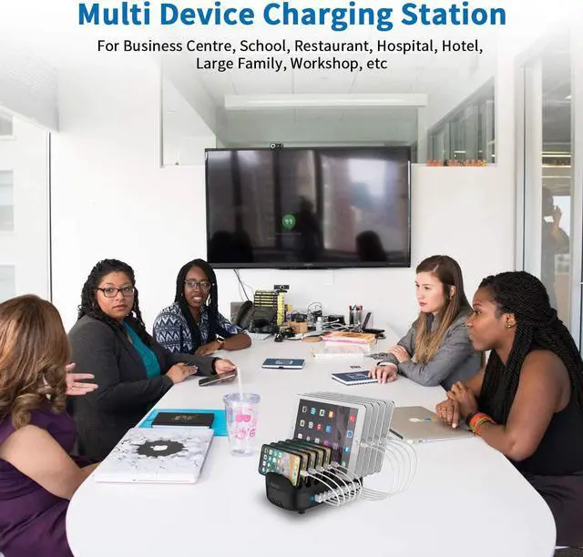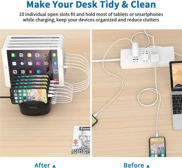 [CLEAN & TIDY]: 10-Slot USB charging station neatly stores and charges up to 10 mobile phone, tablet and other devices at the same time. Charge all your devices at one place and avoid cable chaos. Keep your desktop clean and tidy. With a single multi-port USB charging station, there requires less USB wall chargers and outlets in your offices, kitchens, bedrooms, counters, tables or bedside tables..
