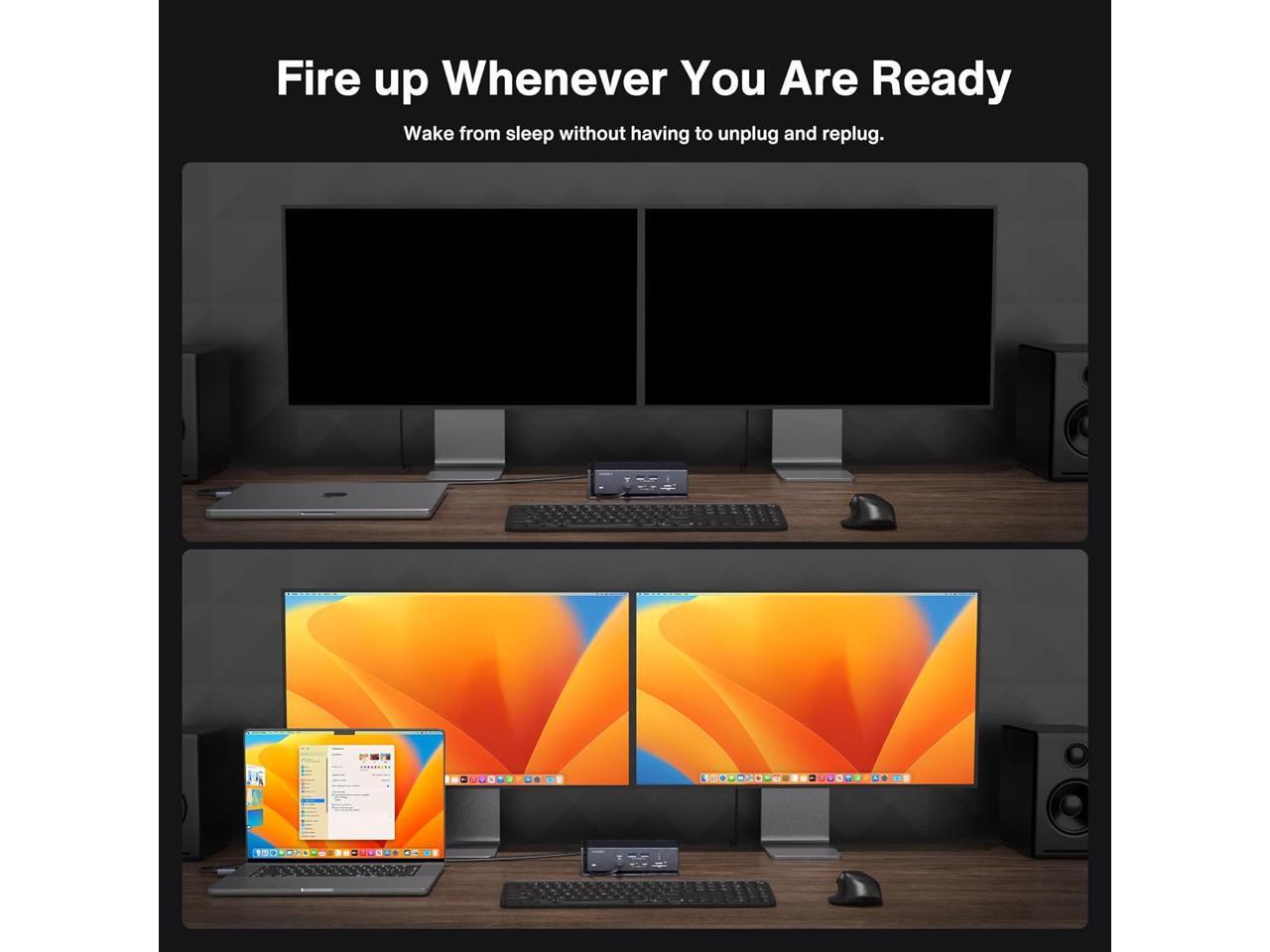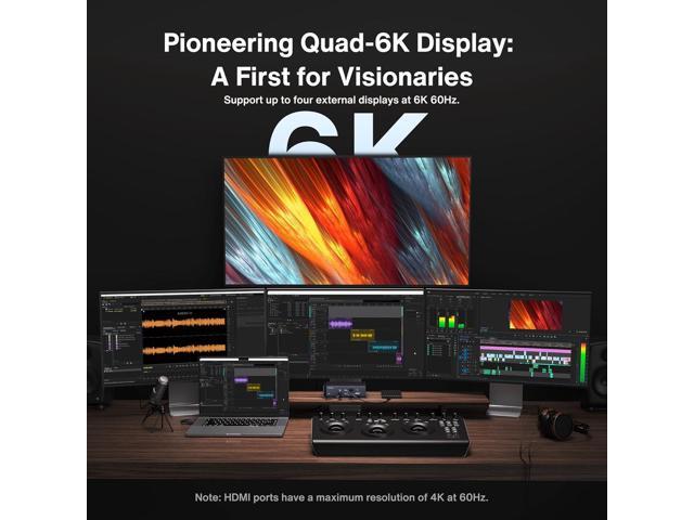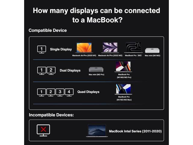 - 1.Quad 6K@60Hz Displays:Only the 2021/2023 MacBook Pro series with M1/M2 Max chips supports quad extended displays. The 2021/2023 MacBook Pro series with M1/M2 Pro chips only supports dual 6K@60Hz displays. The 2020/2022 Mac series with M1/M2 chips only supports a single 6K@60Hz extended display. NOTE: This dock is not compatible with any windows laptop