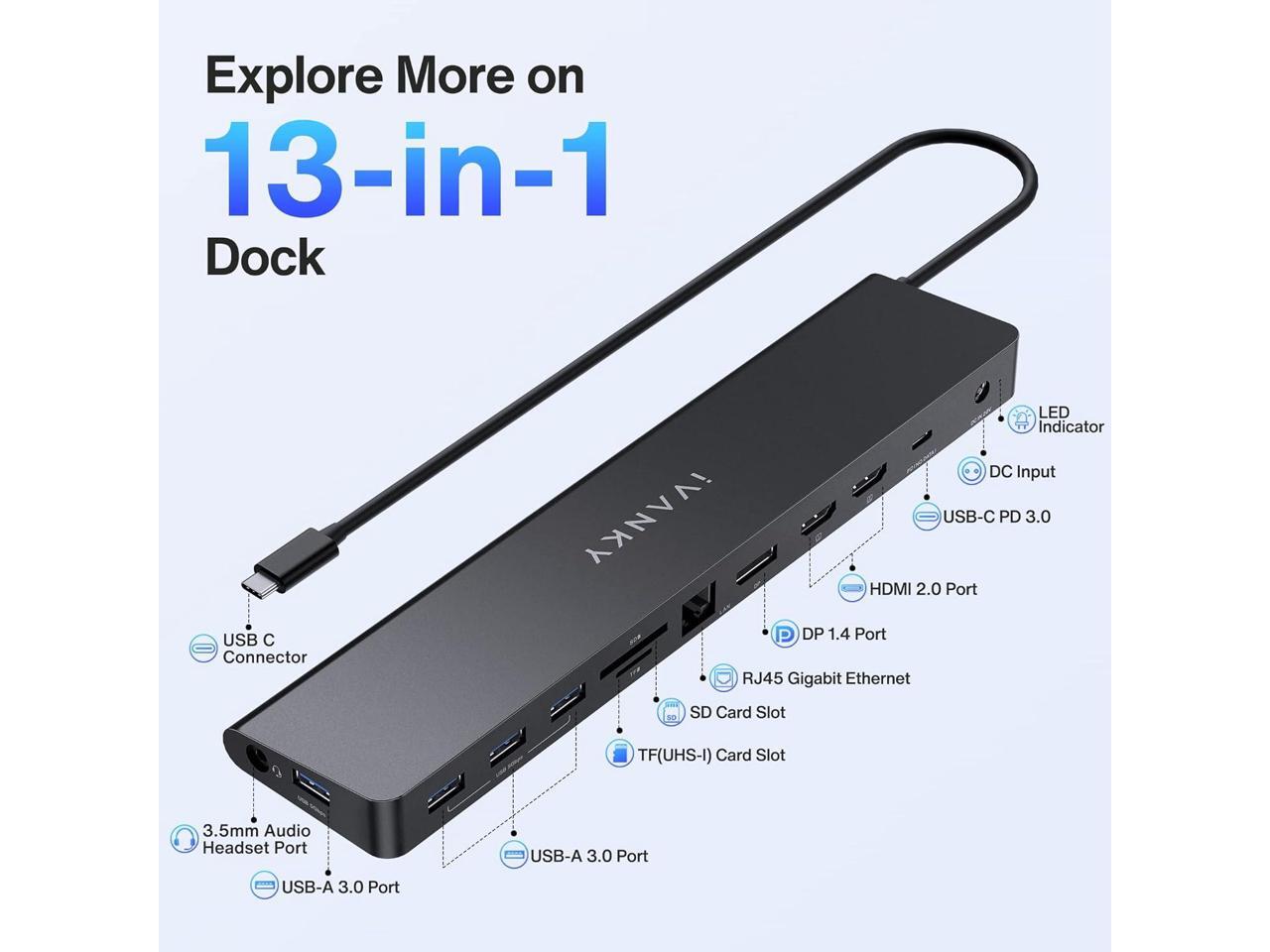 iVANKY Laptop Docking Station with 100W Power Adapter USB C 13-in-1 Triple Display Thunderbolt 3/4 Dock, Dual Monitor For Dell, HP, ASUS, Surface, Acer, etc, DP, 96W PD, USB 3.0, SD/TF
