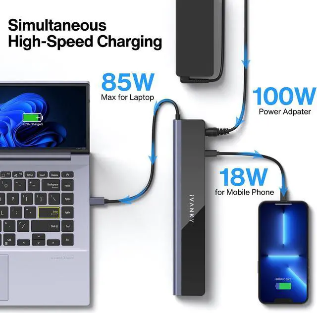 85W Laptop ChargingWith the 100W power adapter, this dock supports up to 85W laptop charging or go down to 65W while the 18W PD port is occupied for charging your phone or tablet