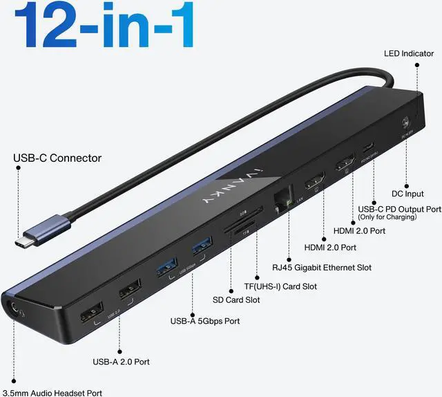 iVANKY EdgeDock 1 USB C Laptop Docking Station with 100W Power Adapter, 12-in-1 85W PD Dock, Dual 4K HDMI Monitor Thunderbolt 3/4 Hub USB 3.0, SD/TF, Ethernet
