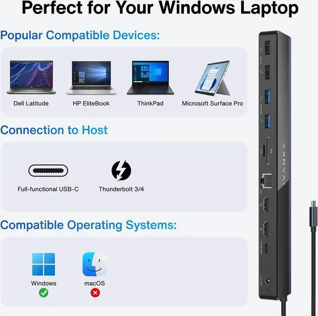 Broad CompatibilityThis dock is perfect for windows laptop with USB-C 4.0 port, Thunderbolt 3/4 port or full-functional USB-C port, its also compatible with USB-C gaming device. NOTE: It does not support thunderbolt protocol input accessories