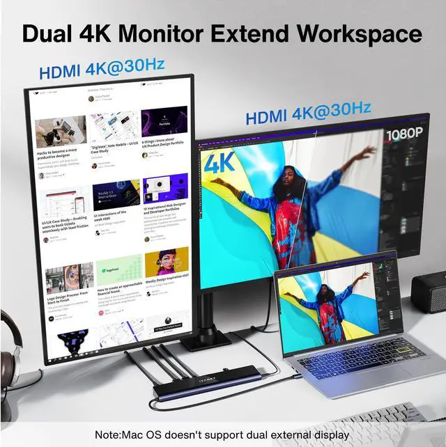 Dual 4K@30Hz DisplaysNo need to download any driver, just connect to 2 HDMI ports and you can use the dual monitors in 4K@30Hz