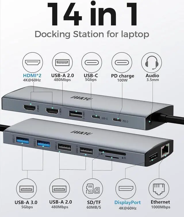 14-in-1 USB-C Docking StationConnect more with IAVKYU USB-C Dock, ideal for professionals and tech enthusiasts. Compatible with USB-C & Thunderbolt 3 laptops, it offers dual 4K HDMI, DisplayPort, two USB 3.0 (5Gbps), a USB-C data port (5Gbps), three USB 2.0 ports, an audio jack & SD/TF card reader. Also includes a powerful 100W PD charging feature to keep your device powered during heavy-duty work or gaming.