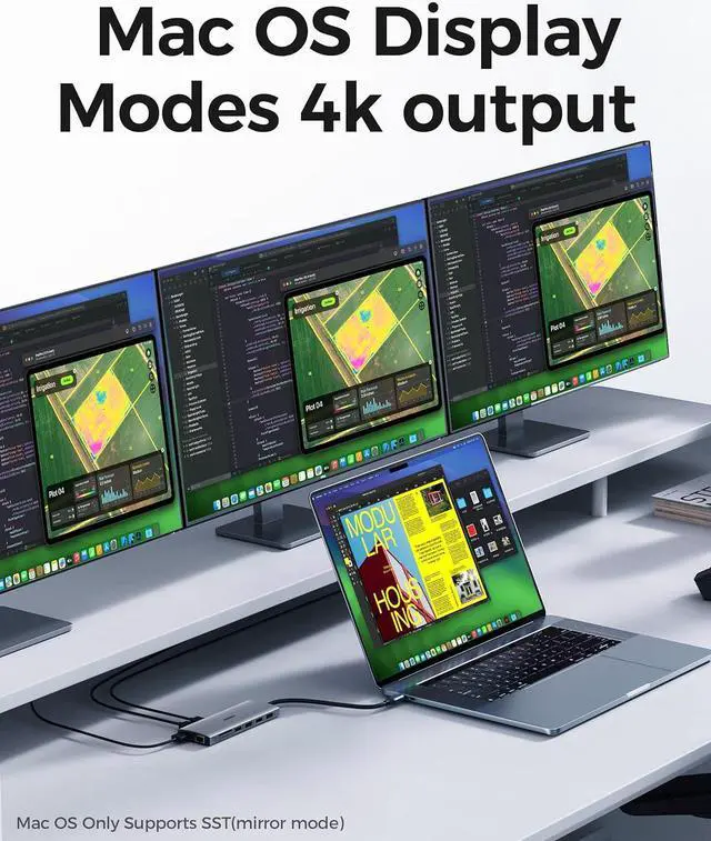 Display InformationFor macOS and iPadOS users, this 3-monitor docking station offers a consistent viewing experience with Single Stream Transport (SST) mode, ensuring a unified display across all connected monitors. Windows users gain from the Multi-Stream Transport (MST) mode, enabling individual content on multiple screens for optimal multitasking capabilities.