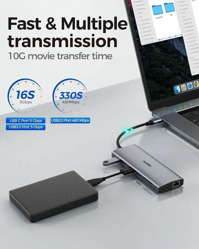 Docking Station 3 Monitors 4K@60HzTransform your laptop into a multi-monitor powerhouse with this USBC hub. Support triple displays in Triple mode (two 4K@60Hz, one 4K@30Hz), or utilize Dual mode for two 4K@60Hz screens. For detailed tasks, the DP port delivers 8K@30Hz or 4K@144/120Hz visuals. Mac-compatible for mirror display. Ideal for professionals seeking an efficient and compact dock to enhance productivity with extended displays.