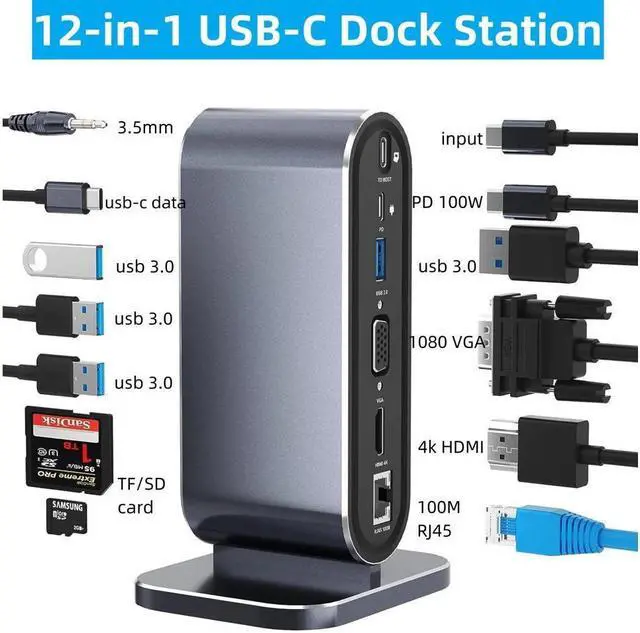 12 in 1 USB C Laptop Docking Station Model4K HDMI+VGA 1080P + PD 100W + SD + TF + USB 3.0 *4 + RJ45 + 3.5 mm Audio + USB-C date port