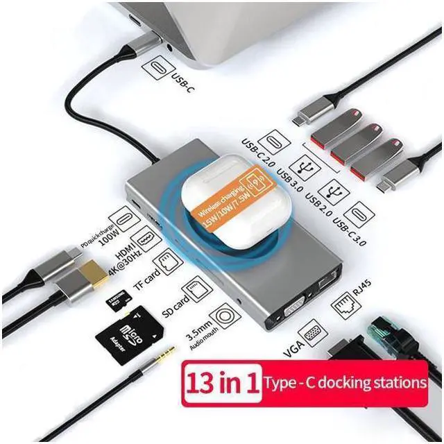 USB-C Hub: Mac Adapter is easily fufill your daily use. It mainly extends your thunderbolt 3/Type C devices to 4K@30hz HDMI, VGA, network RJ45 interface, USB 3.0 / 2.0, USB-C 2.0 / 3.0, SD/TF card reader, 3.5 mm Audio jack and 100W PD Type-C charging port, Wireless Charging!