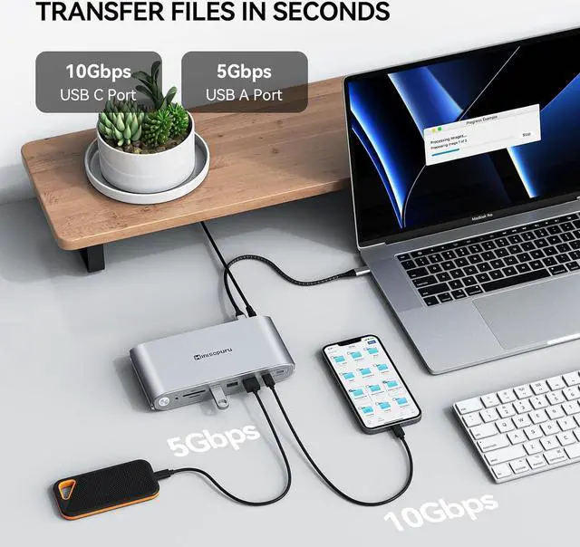 Super-speed Data Transfer Experience: The docking station 3 monitors feature 3x USB A 3.2G en1 and 2x Type-C ports, supporting data transfer speeds up to 5 or 10Gbps that effortlessly transfer videos and other files within seconds. It can also charge your external devices at the same time. The 3 monitor docking station is also equipped with a TF/SD card slot is very suitable for editors and for use in travel, business trips, at home, meetings, etc.