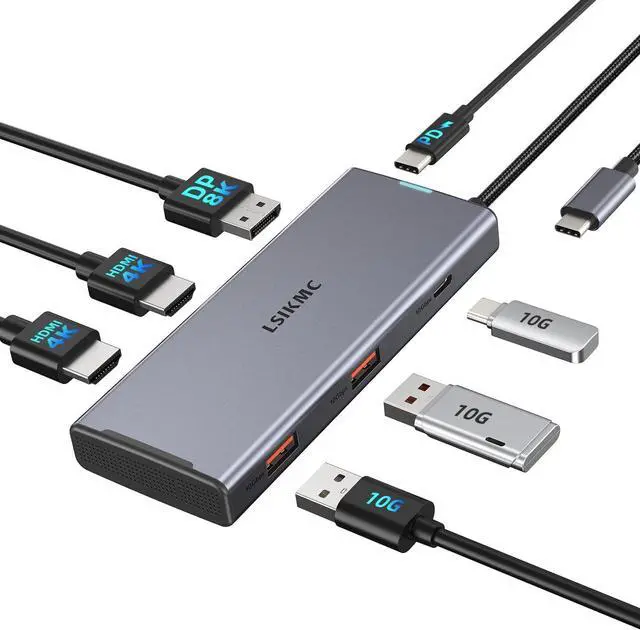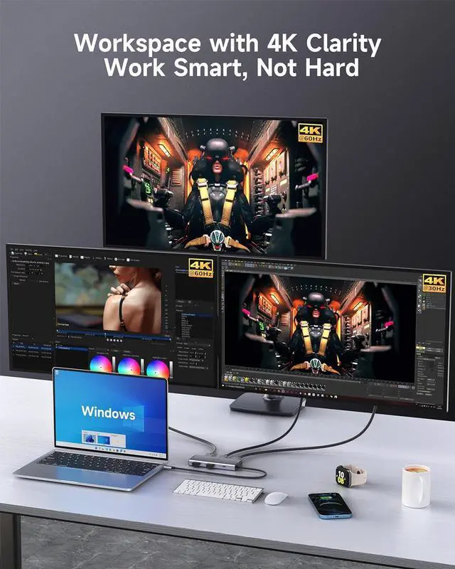 7-in-1 Universal Docking StationTransform your workspace with a triple monitor docking station that offers dual HDMI for 4K displays, an 8K display port option, high-speed USB ports for swift data transfer, and 100W Power Delivery for efficient charging.